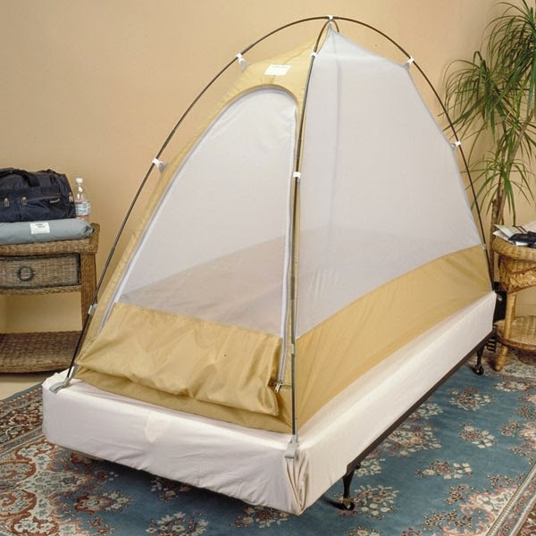 Otra opción, es llevaros de casa una mosquitera, claro que luego a ver de donde la colgaís... Y otra alternativa, más cara y más pesada, es comprar una Travel Tent. Es una mezcla entre mosquitera y tienda de campaña, que se coloca encima de la cama y evita que los mosquitos, cucarachas u otros bichejos accedan a tu piel... Pesa 1kg y abulta como un saco de dormir, pero deberéis valorar si merece la pena cargar con ello. Tal vez si viajáis por África sí, porque el riesgo de contraer malaria es bastante elevado y puede que lo uséis bastante, pero para otras zonas menos peligrosas puede resultar un trasto... Eso lo decidís vosotros.